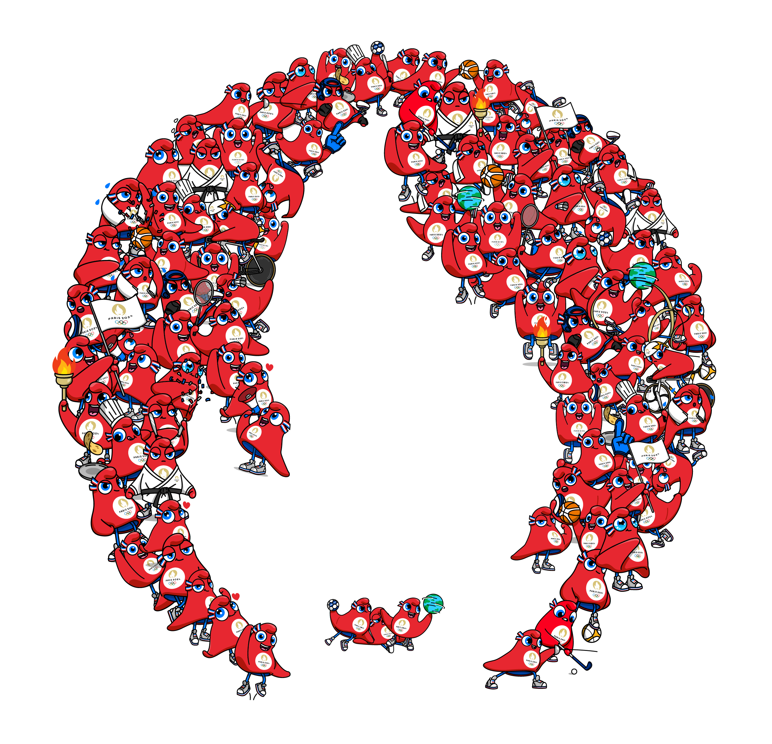 Recherches créatives, designs créés pour le brandbook de la Mascotte, ainsi que pour le styleguide (livre d’inspiration de design pour les licenciés Paris 2024).